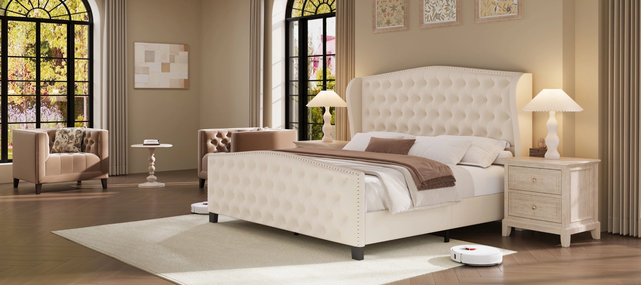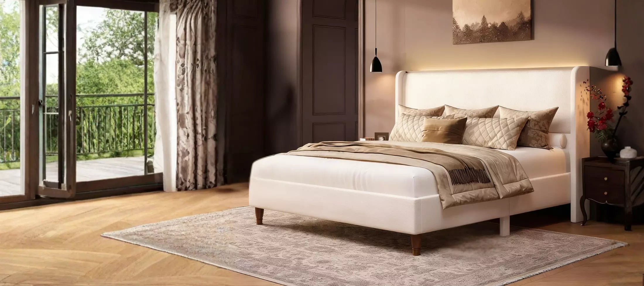 Arc Tall Headbaord Linen Upholstered Platform Bed Frame with LED Lights & Charging Station