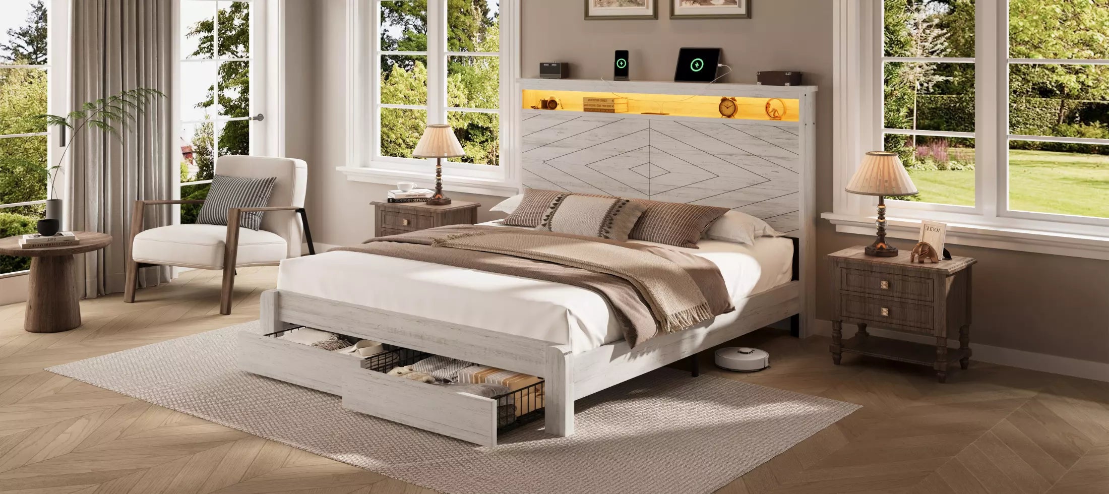 Arlo Farmhouse Wood Bed Frame, 52" Tall Headboard with Led Lights,Charging Station and 2 Drawers