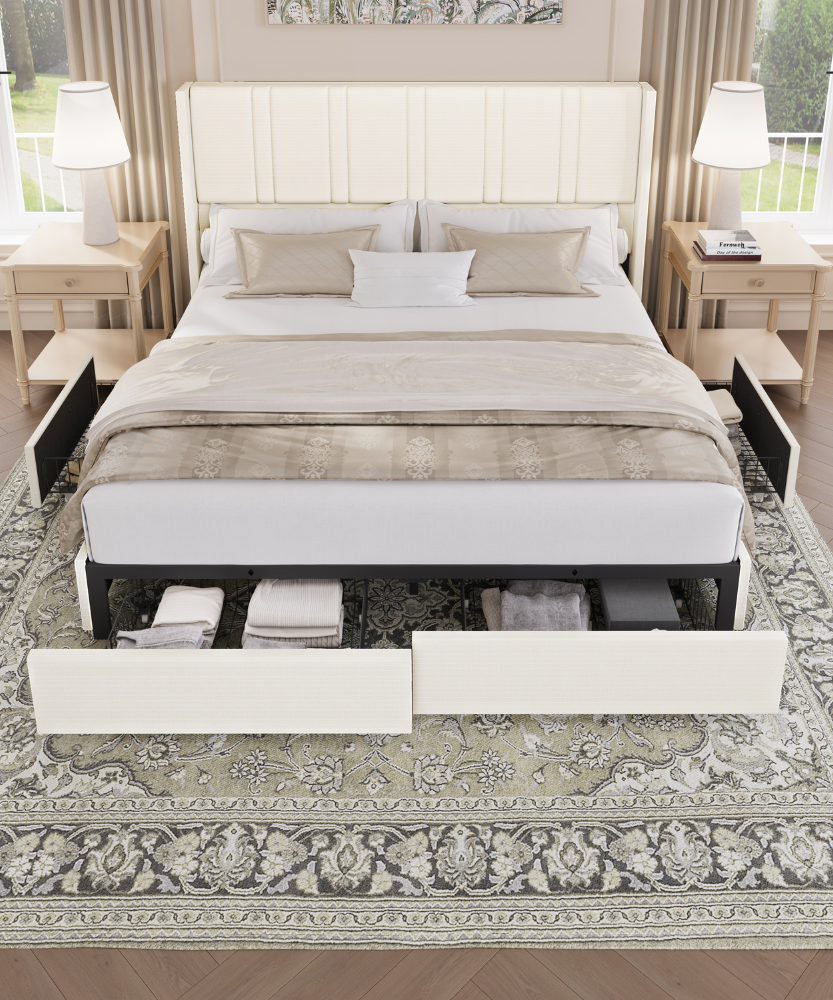 Modro Linen Upholstered Platform Bed Frame with 4 Storage Drawer