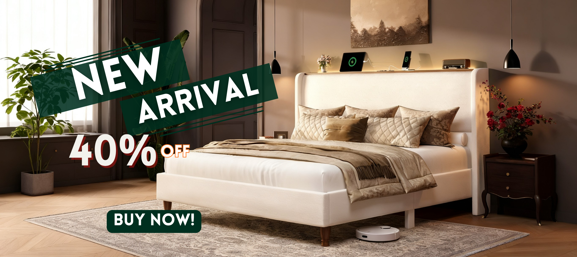 Arc Tall Headbaord Linen Upholstered Platform Bed Frame with LED Lights & Charging Station