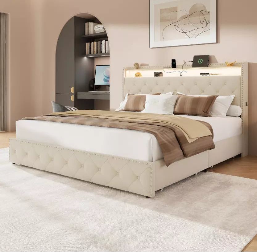 Covae Boucle Bed Frame with Storage Headboard,LED Lights,Charging ports and Underbed Drawers