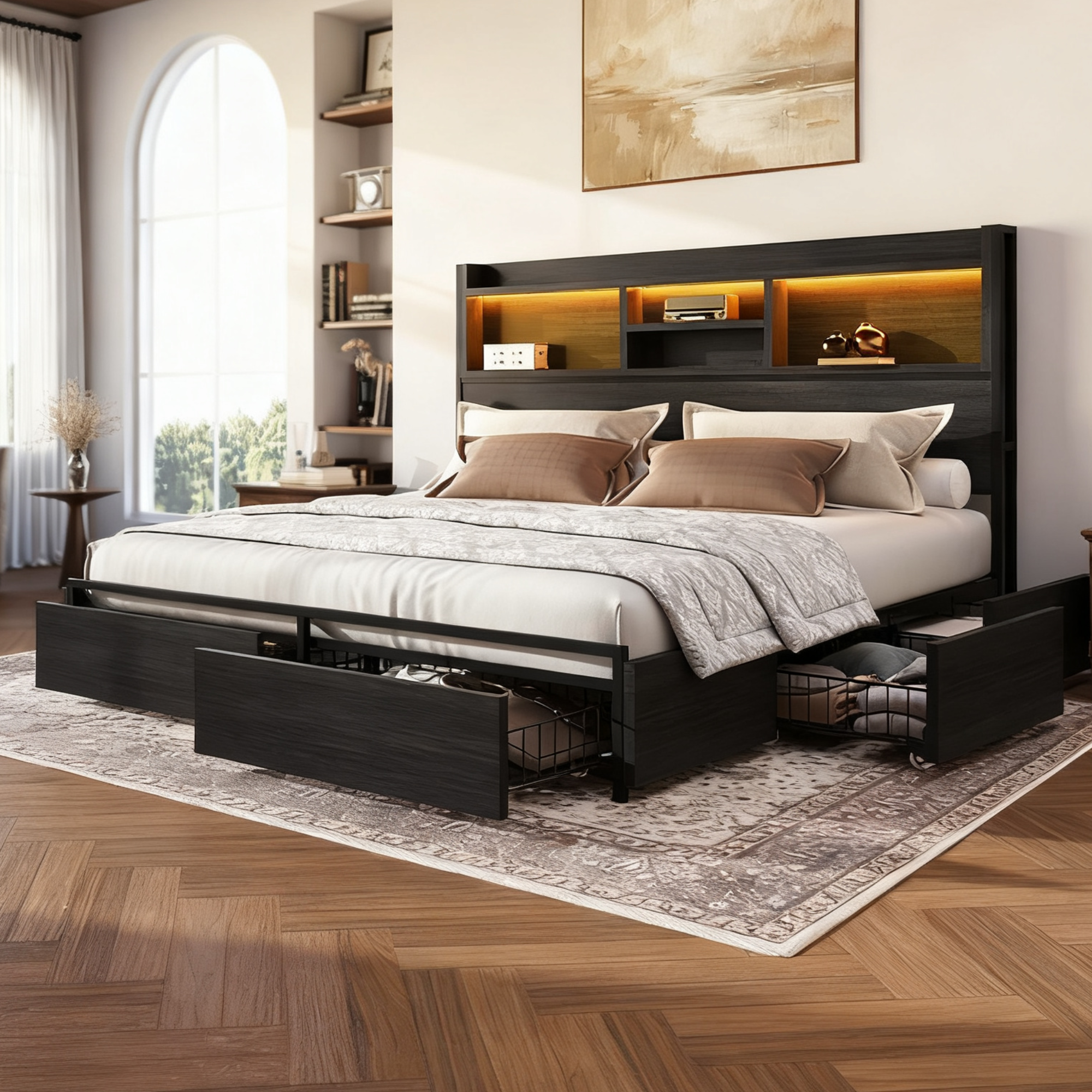 Cubes Industrial Bed Frame with Storage Drawers,Bookcase Headboard, LED Llight & Charging Hub