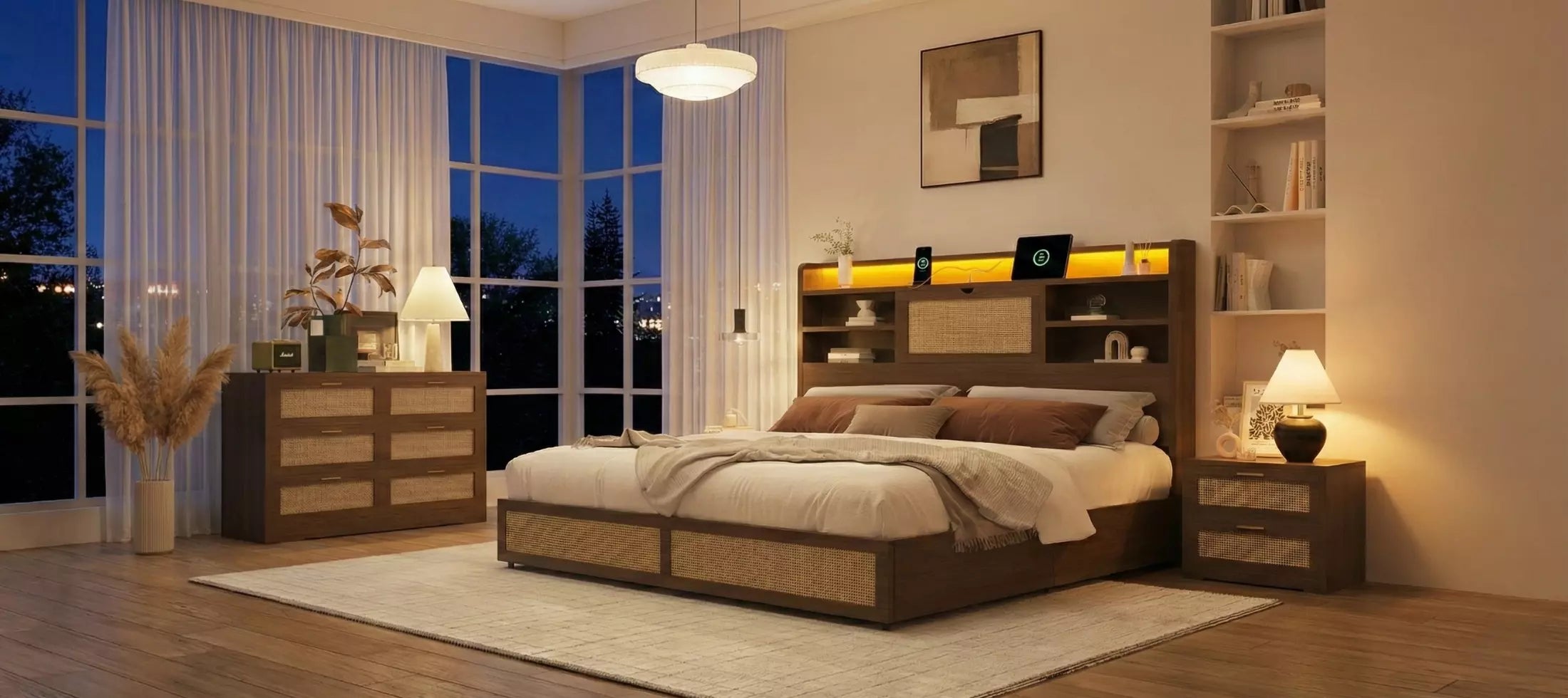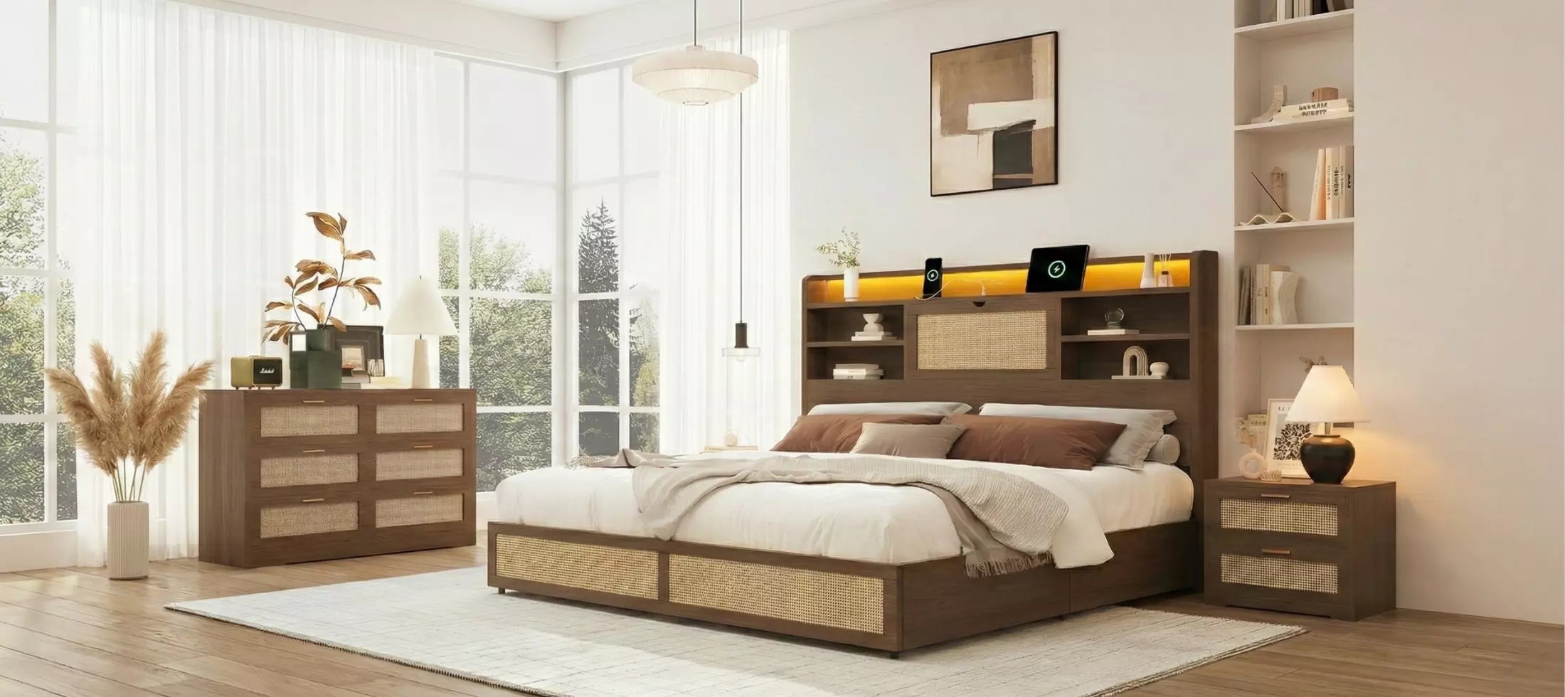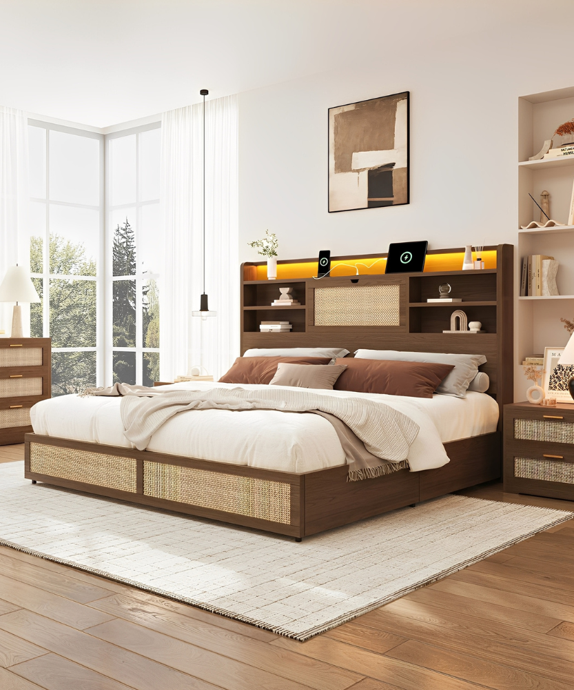 Sleep, Store, & Charge in Style. Upgrade your sanctuary with the Larmace Boho Chic Bed Frame. Combining the timeless charm of hand-woven rattan with a modern tiered bookcase headboard, this frame is designed to declutter your life while setting the perfect mood with customizable RGB lighting.