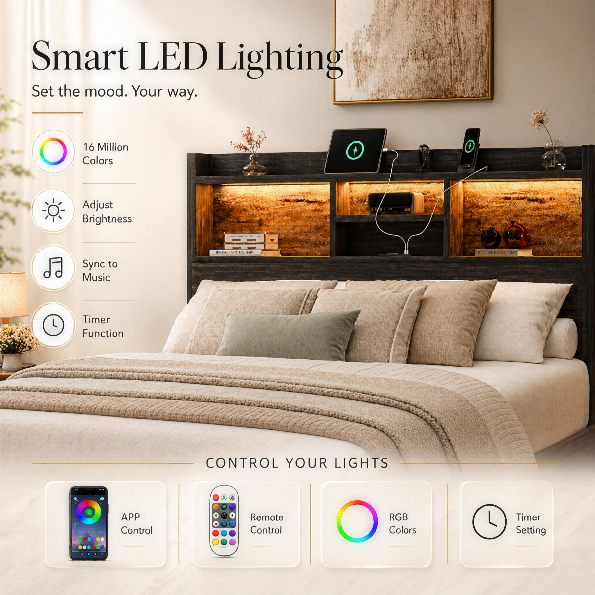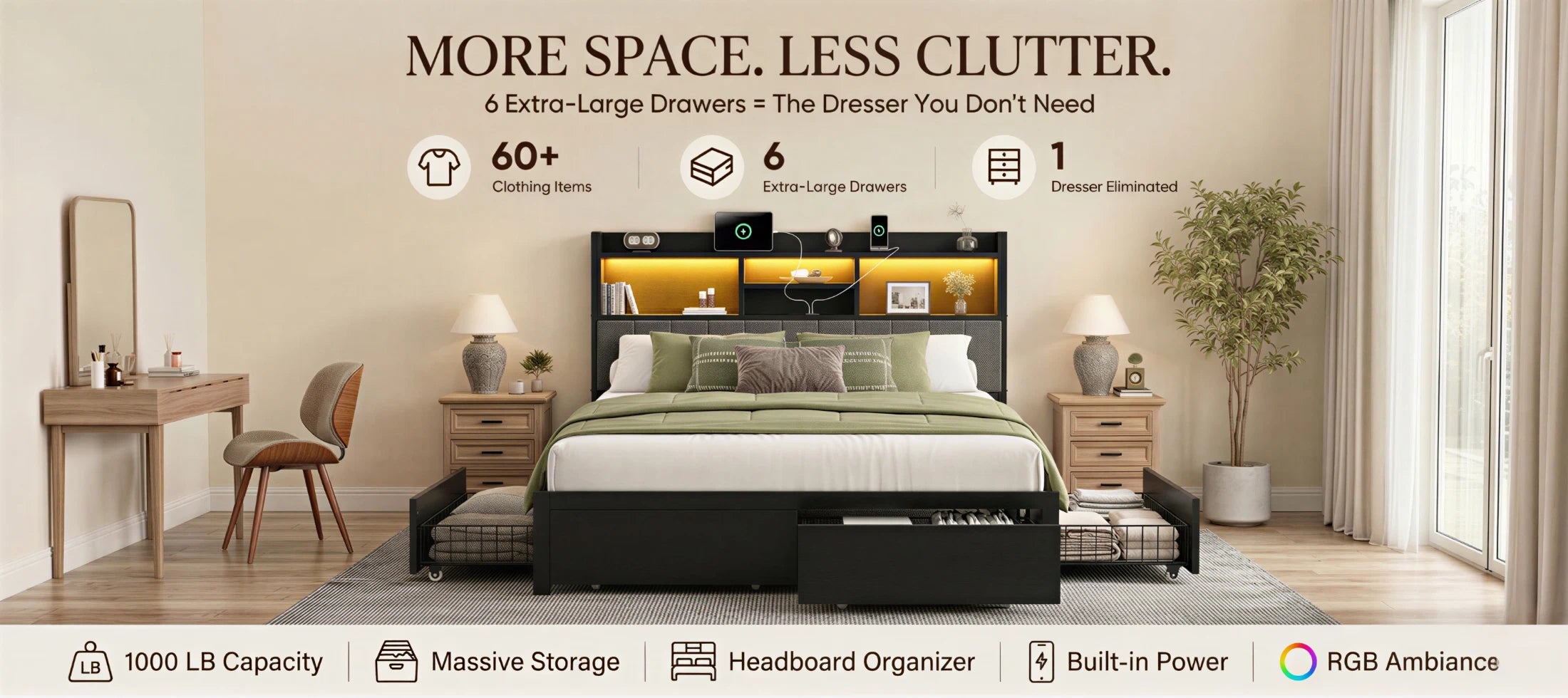 Maximize your bedroom space with the Softo Luxe Storage Bed Frame. Featuring 6 massive under-bed drawers for ultimate organization and a premium upholstered headboard for late-night comfort, this bed is the perfect blend of style and utility. Stay connected with a built-in charging station (USB & Type-C) and set the mood with app-controlled RGB LED lights. Built with a heavy-duty metal frame supporting up to 1000 lbs, it offers a noise-free, box-spring-free sleep experience.