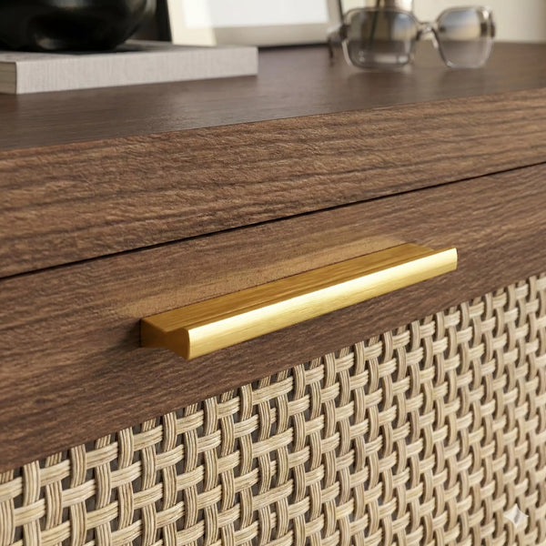 • Modern Gold Accents: Minimalist gold aluminum handles add a touch of luxury to the rich wood tones.