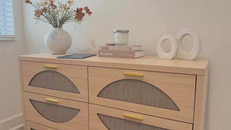 Bring a touch of organic warmth and mid-century soul to your sanctuary. Our Arched Boho Rattan 6 Drawer Dressers-Walnet / Oak Rattan 6-Drawer Dresser,balances a rich walnut finish with intricate woven textures, creating a timeless focal point that feels both grounded and airy. It’s not just storage; it’s a statement piece that whispers "home."Style.