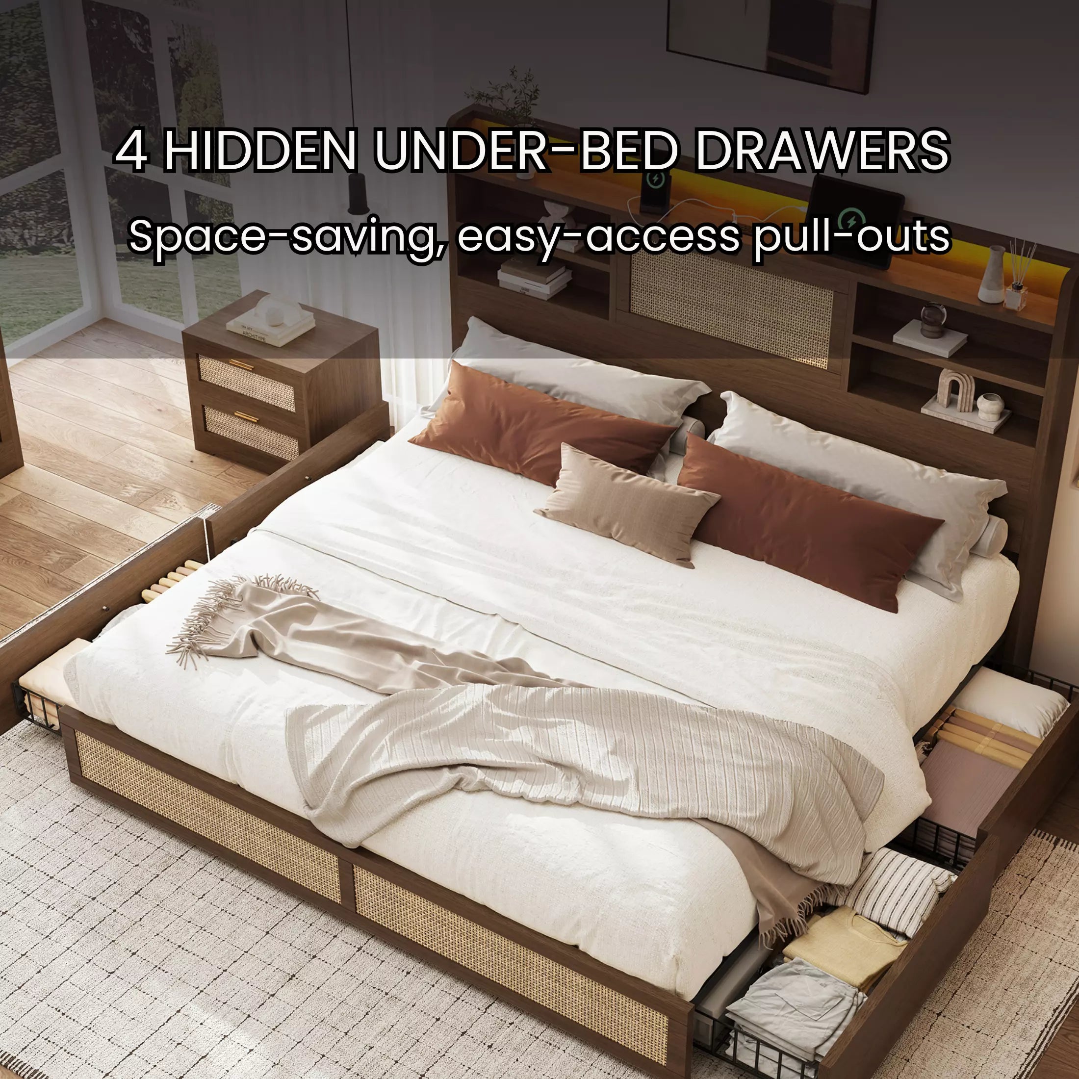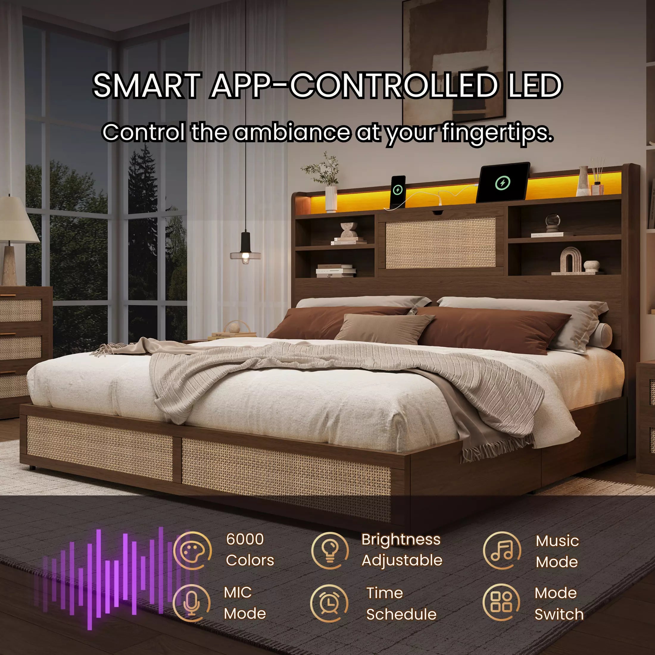 Sleep, Store, & Charge in Style. Upgrade your sanctuary with the Larmace Boho Chic Bed Frame. Combining the timeless charm of hand-woven rattan with a modern tiered bookcase headboard, this frame is designed to declutter your life while setting the perfect mood with customizable RGB lighting.