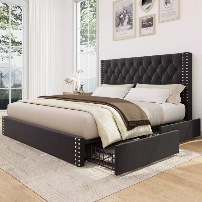 Explore the perfect space-saving solution with Larmace’s storage bed frame. Featuring built-in storage drawers or a storage headboard, this frame is available in king, queen, and full sizes. Choose from modern colors like gray, black, white, and beige, and enjoy the elegant tufted velvet or linen upholstery to complement your bedroom décor.