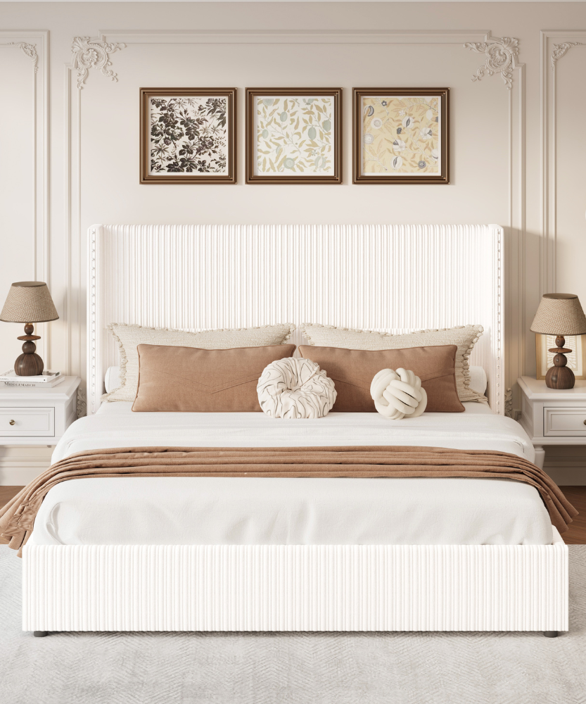 This modern upholstered bed frame features premium corduroy fabric with a soft, textured surface and elegant vertical channel tufting. The channel tufting upholstery adds a sophisticated touch while providing long-lasting comfort. Its timeless modern style complements any bedroom and enhances your sleeping experience.