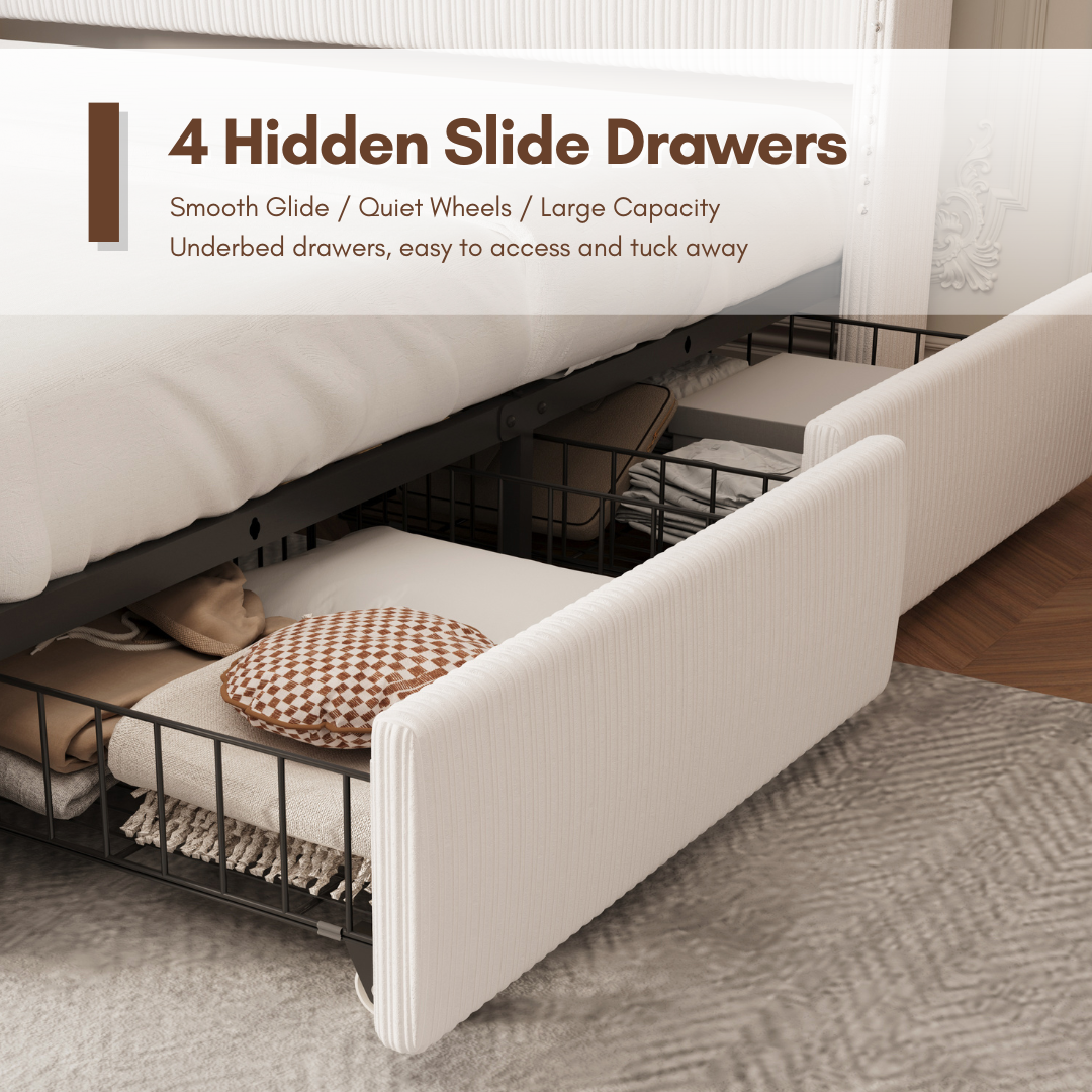 - Hidden wheeled drawers for smooth storage.