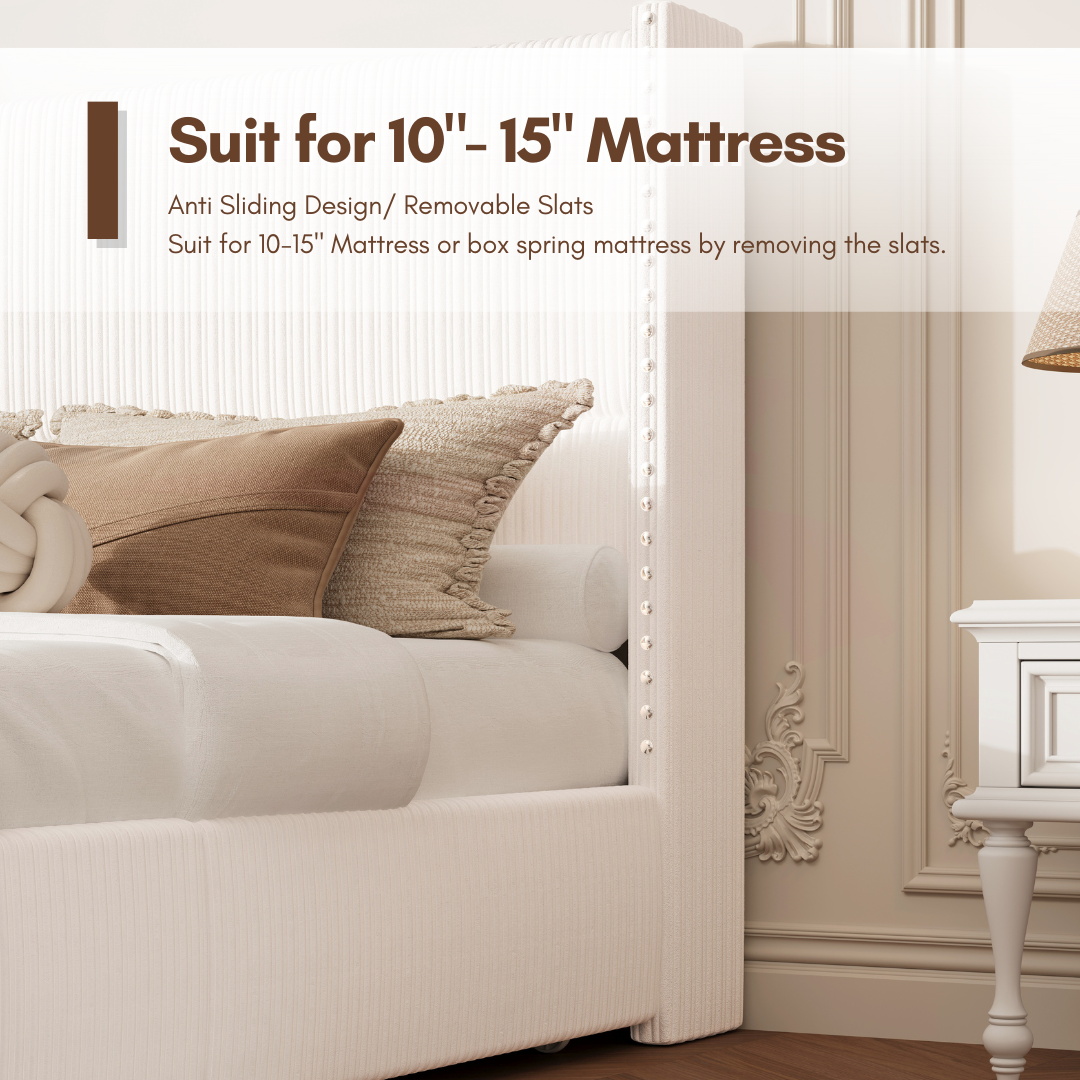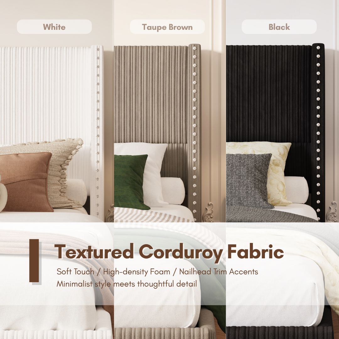 Elysia Corduroy Upholstered Platform Bed Frame with Nailhead Wingback