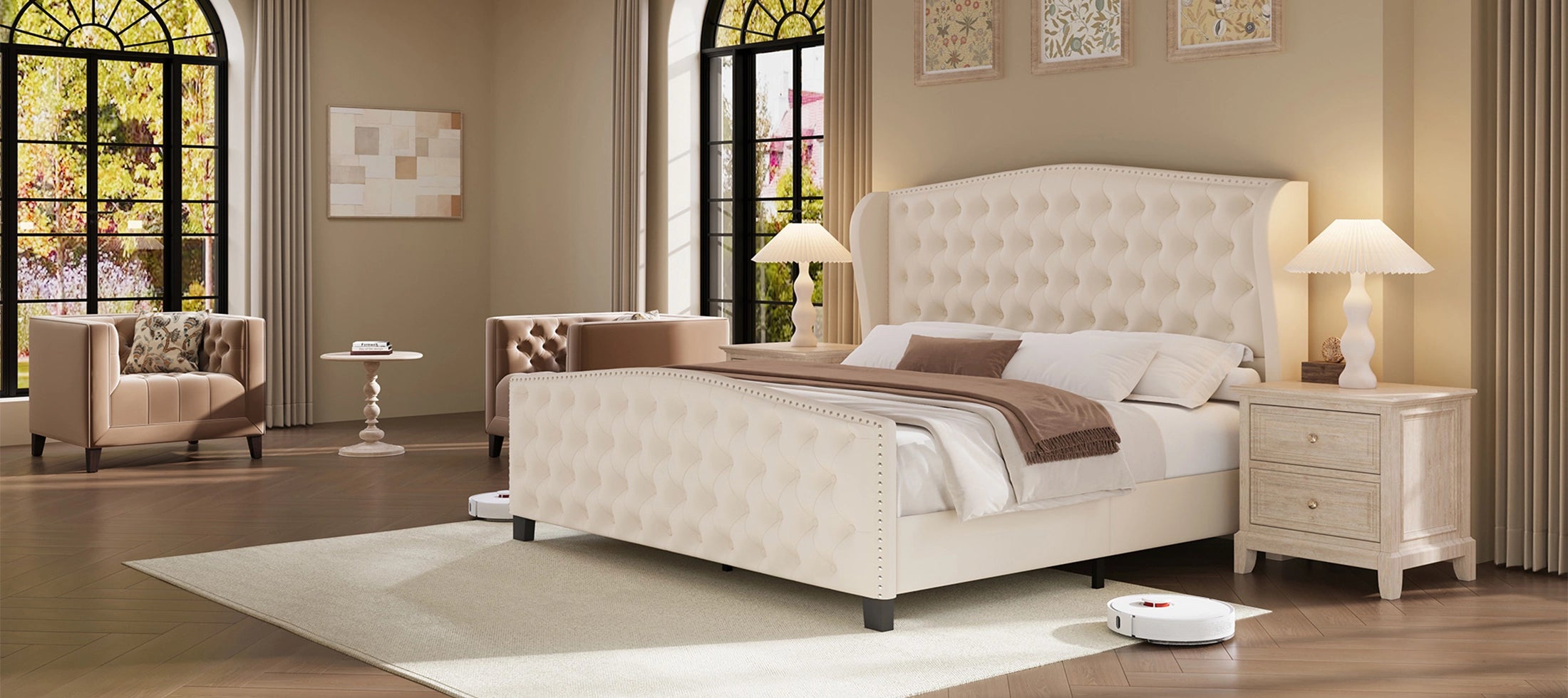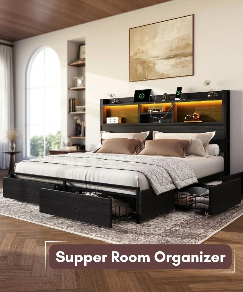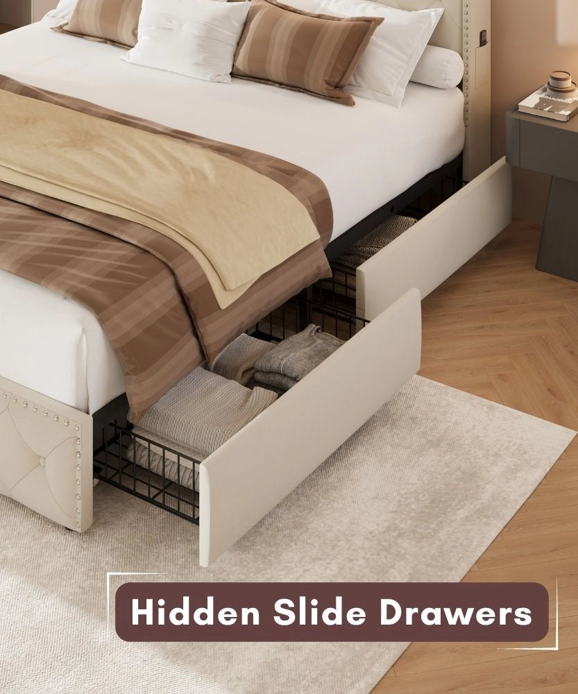 Underbed hidden drawers glide out smoothly and tuck away quietly,perfect for keeping your space clean without clutter.