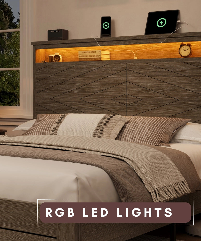 We design bed frames that go beyond sleep — with built-in charging, RGB LED lights, soft cushioned headboards, and clever storage like hidden drawers and headboard shelves.