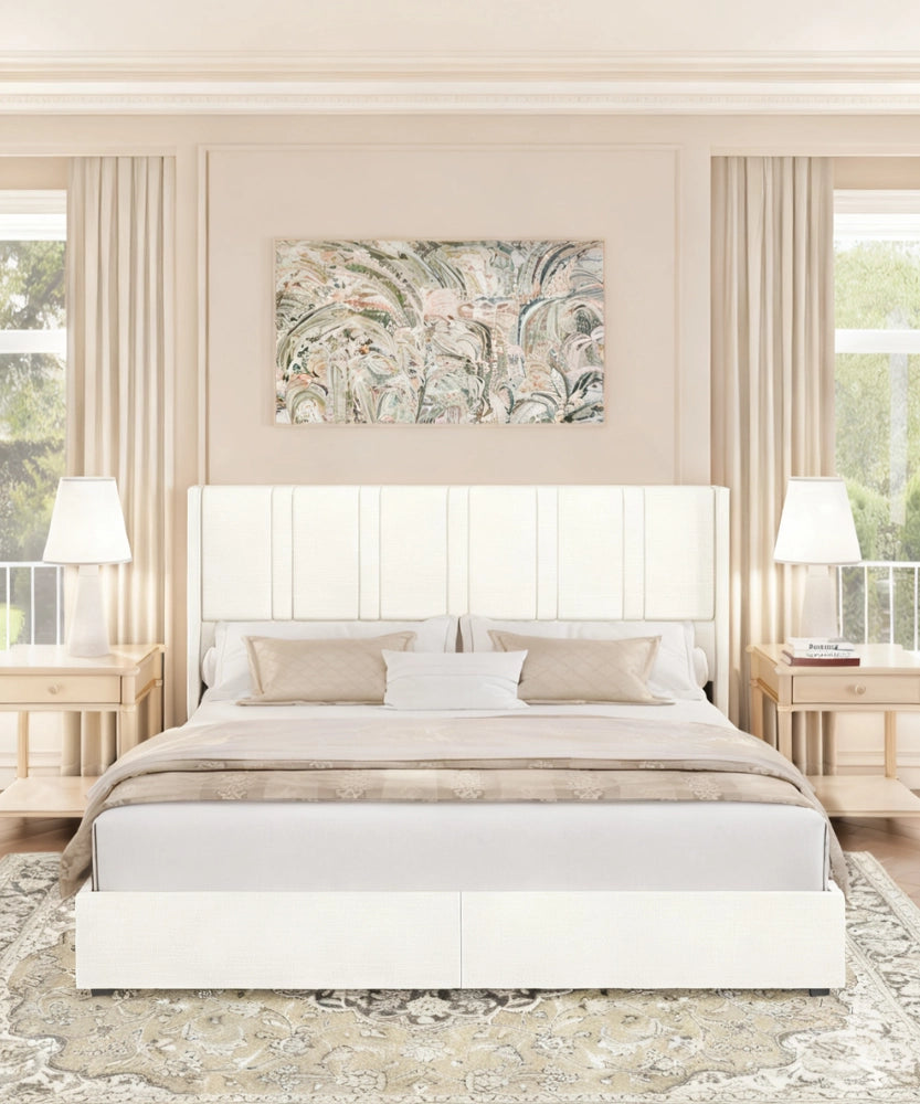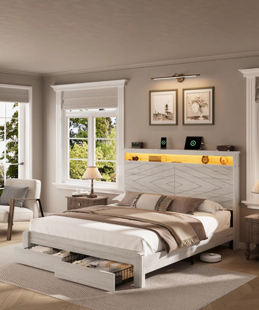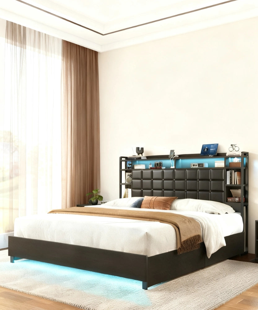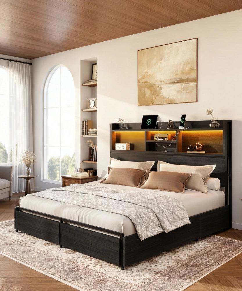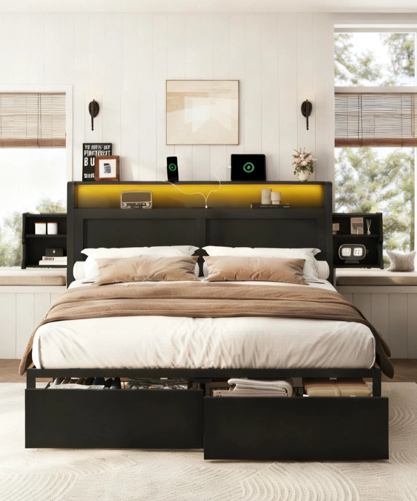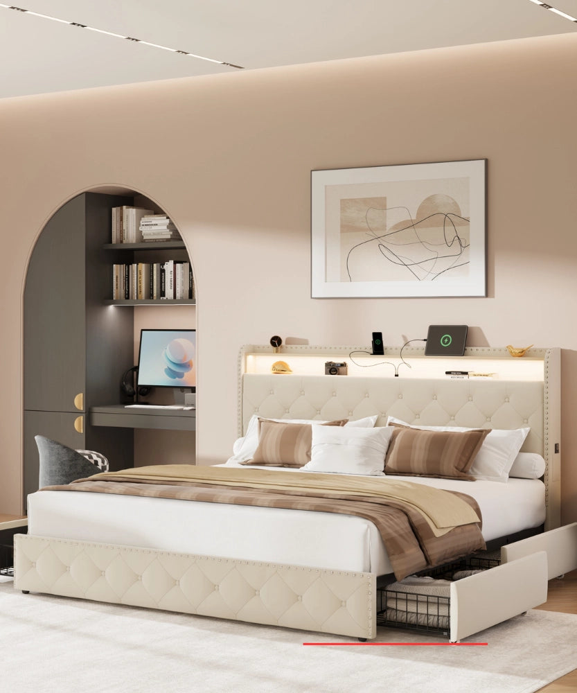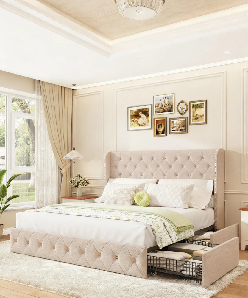upholstered bed frames, storage bed frames with drawers, bookcase bed frames, platform bed frames, and MDF wood bed frames in Full, Queen, and King sizes.