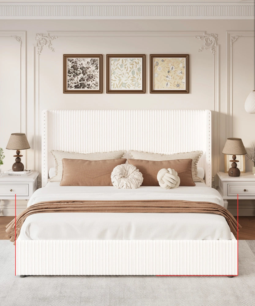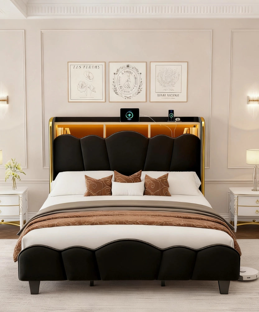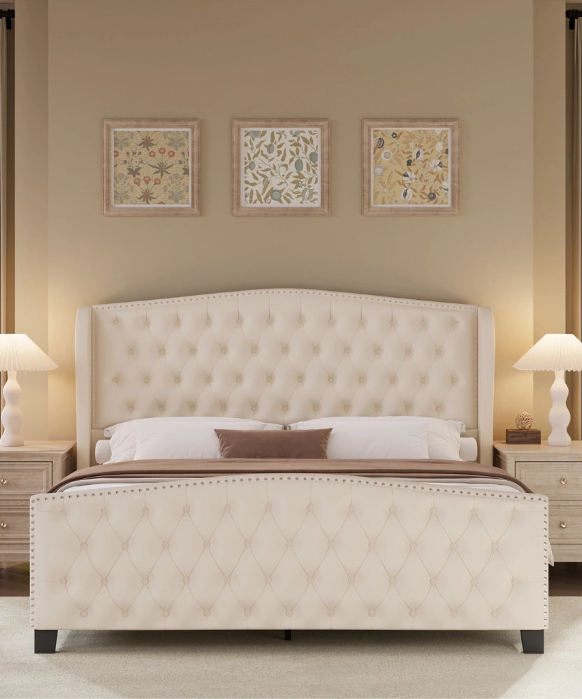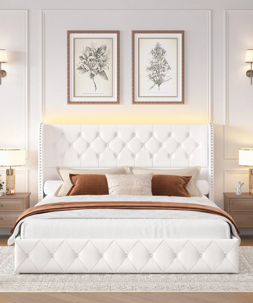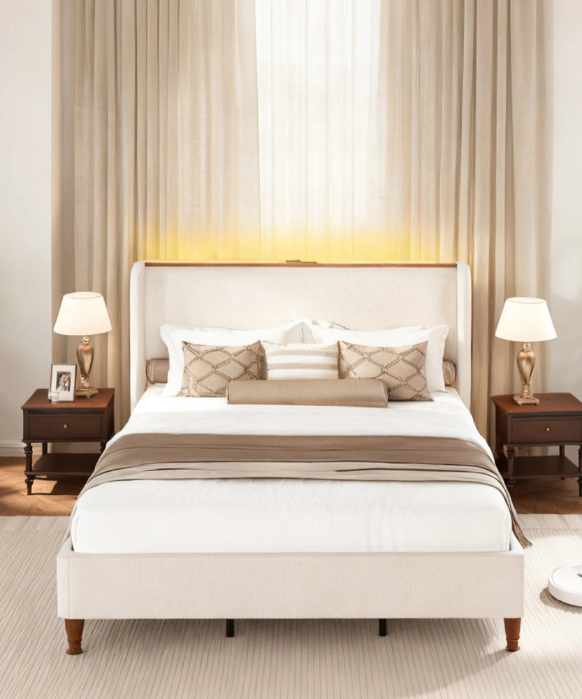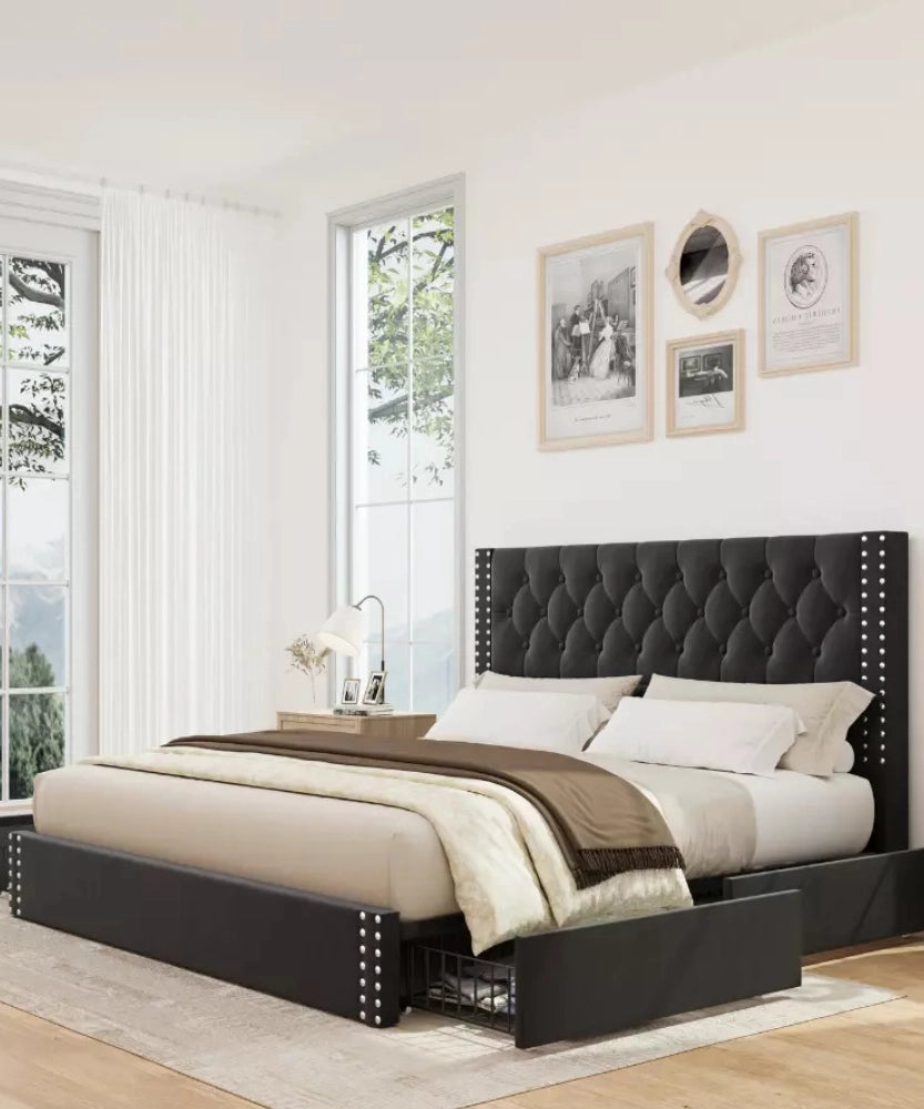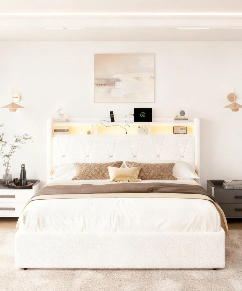 upholstered bed frames, storage bed frames with drawers, bookcase bed frames, platform bed frames, and MDF wood bed frames in Full, Queen, and King sizes.