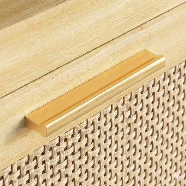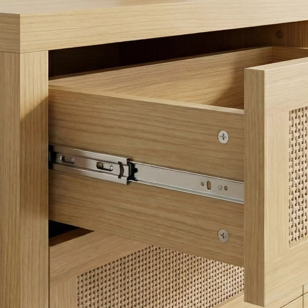 - Drawer Fronts: High-quality Poly-Rattan (Faux Cane Webbing). Smooth to the touch and resistant to humidity.