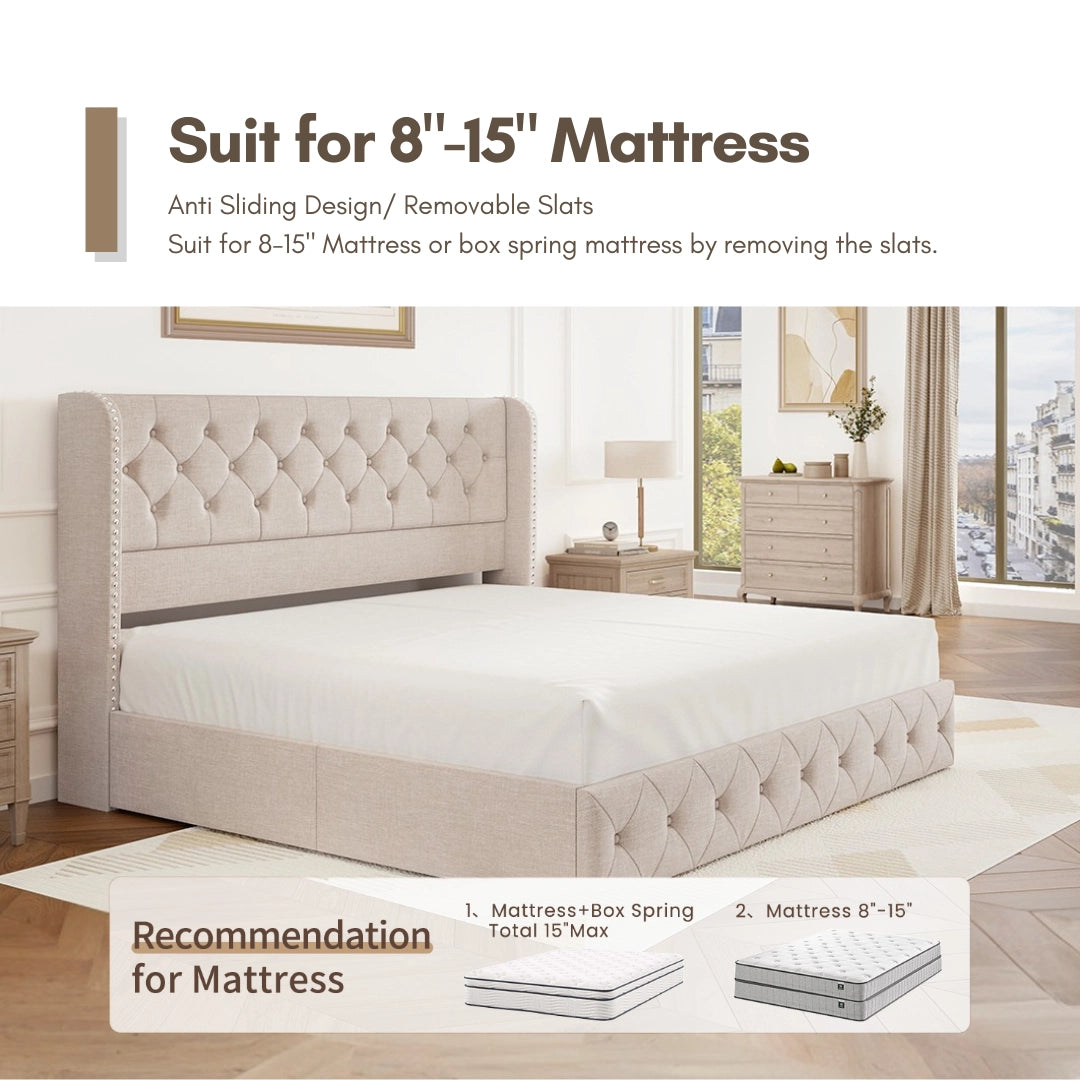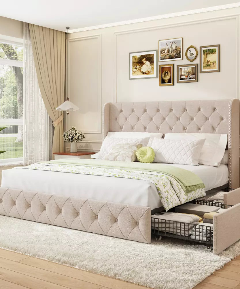 Elevate your bedroom with luxurious comfort and functionality. Featuring a high headboard, spacious storage drawers, sturdy construction, easy assembly, and premium linen fabric—perfect for enduring style and tranquil nights of sleep.