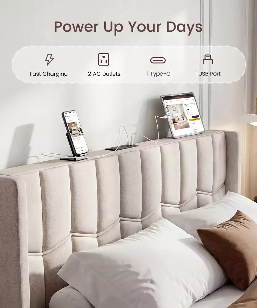 • Discreetly hidden at the top of the headboard. The charging bed frame includes 2 A/C outlets, 1 USB, and 1 Type-C port to keep your devices powered while you rest.