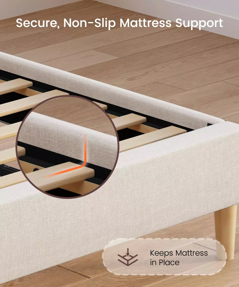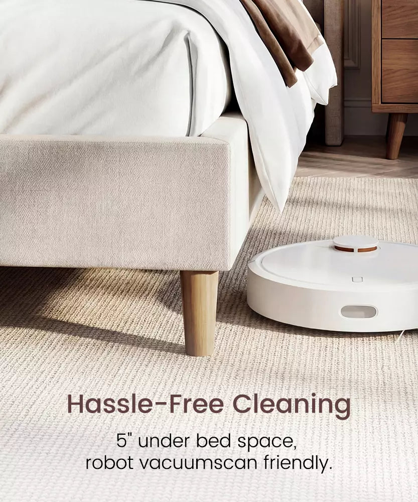 Available in King size and Queen size, this platform upholstered bed frame offers a no box spring design and a massive 1000 lbs weight capacity, blending simplist aesthetics with heavy-duty durability.