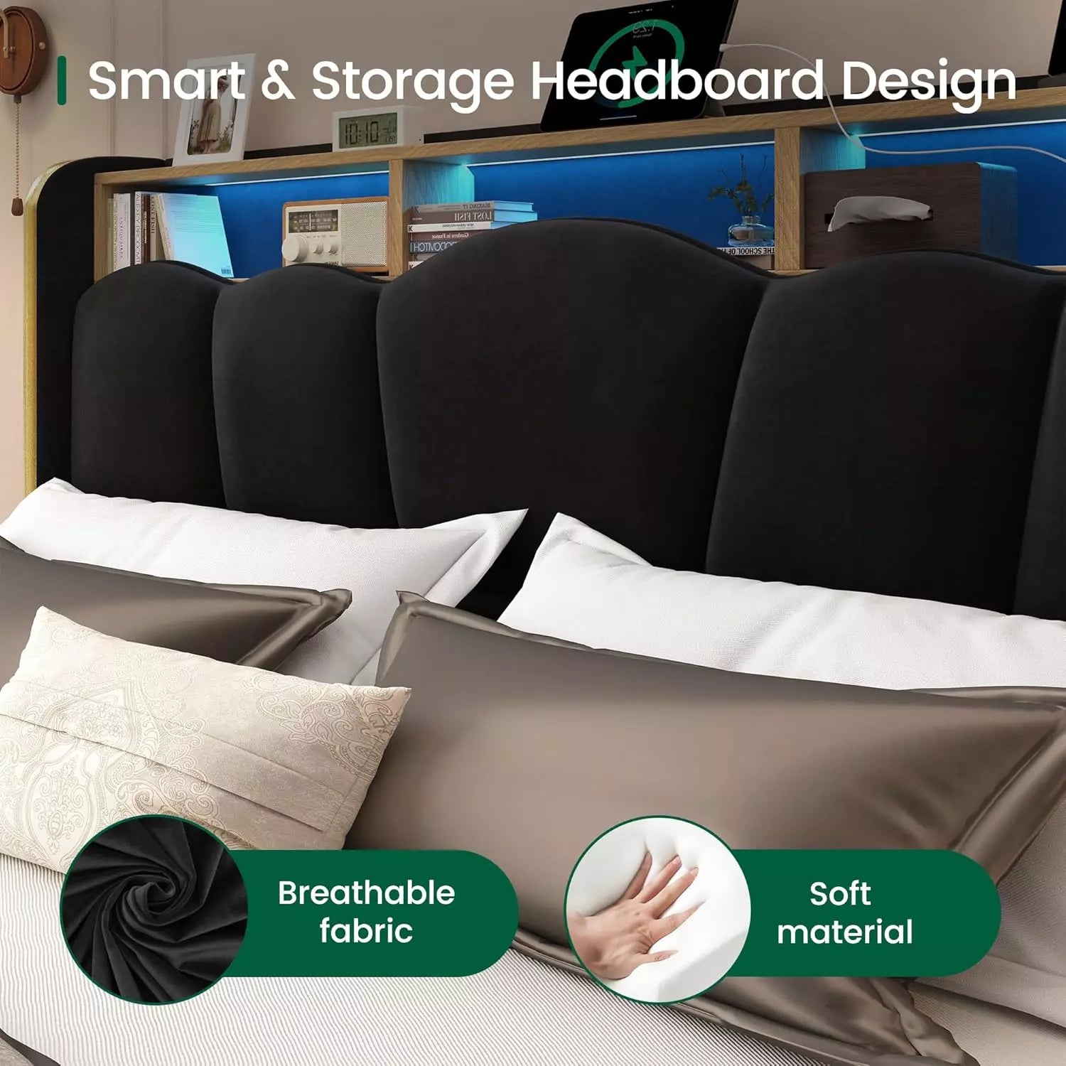 The modern upholstered bed frame effortlessly blends everyday utility with lotus-inspired design. Available in both Queen and King sizes, this frame features a built-in charging station with 2 power outlets, 1 USB port, and 1 Type-C port—keeping your devices powered and your nightstand tidy. A spacious two-tier headboard shelf provides extra room for books, décor, or nighttime essentials.