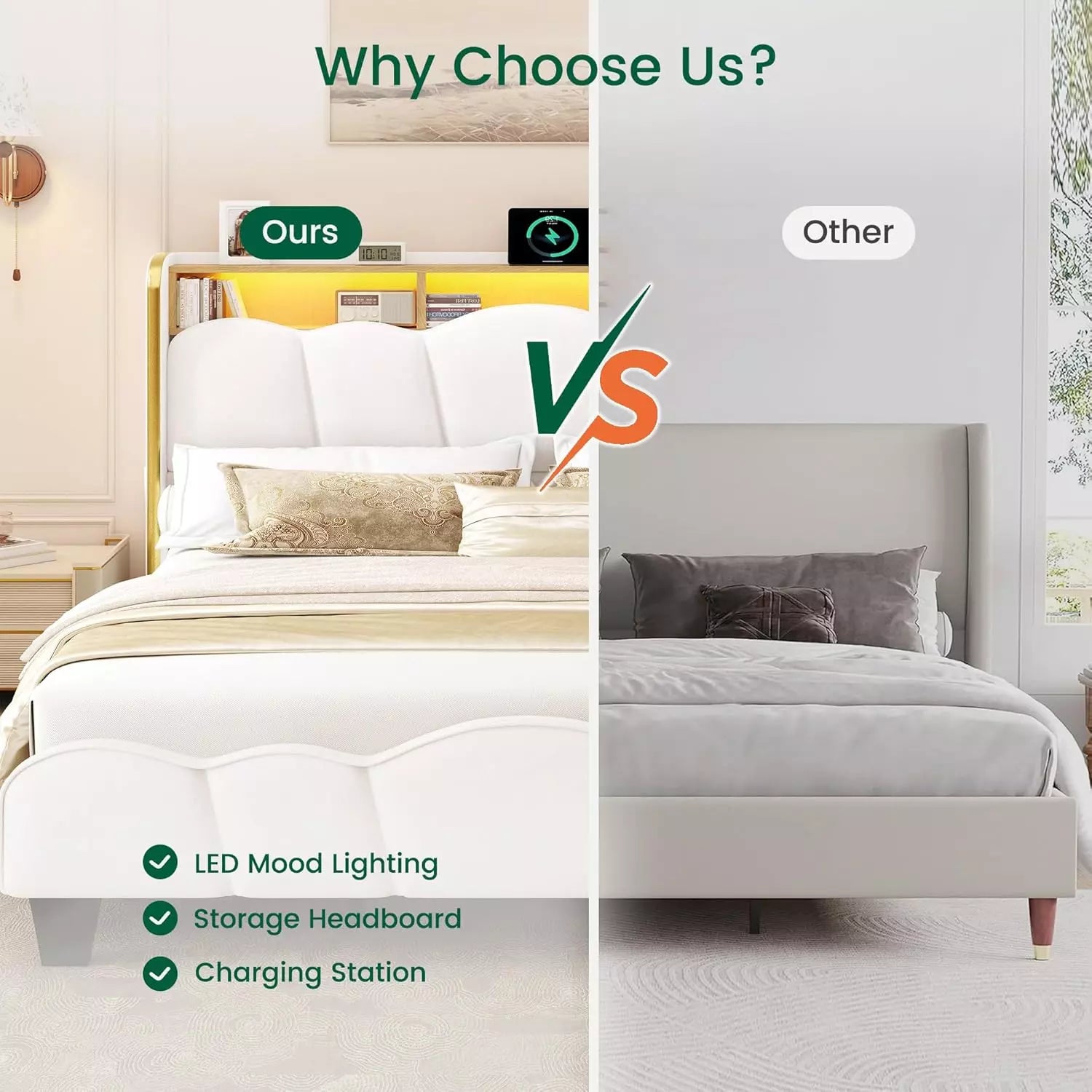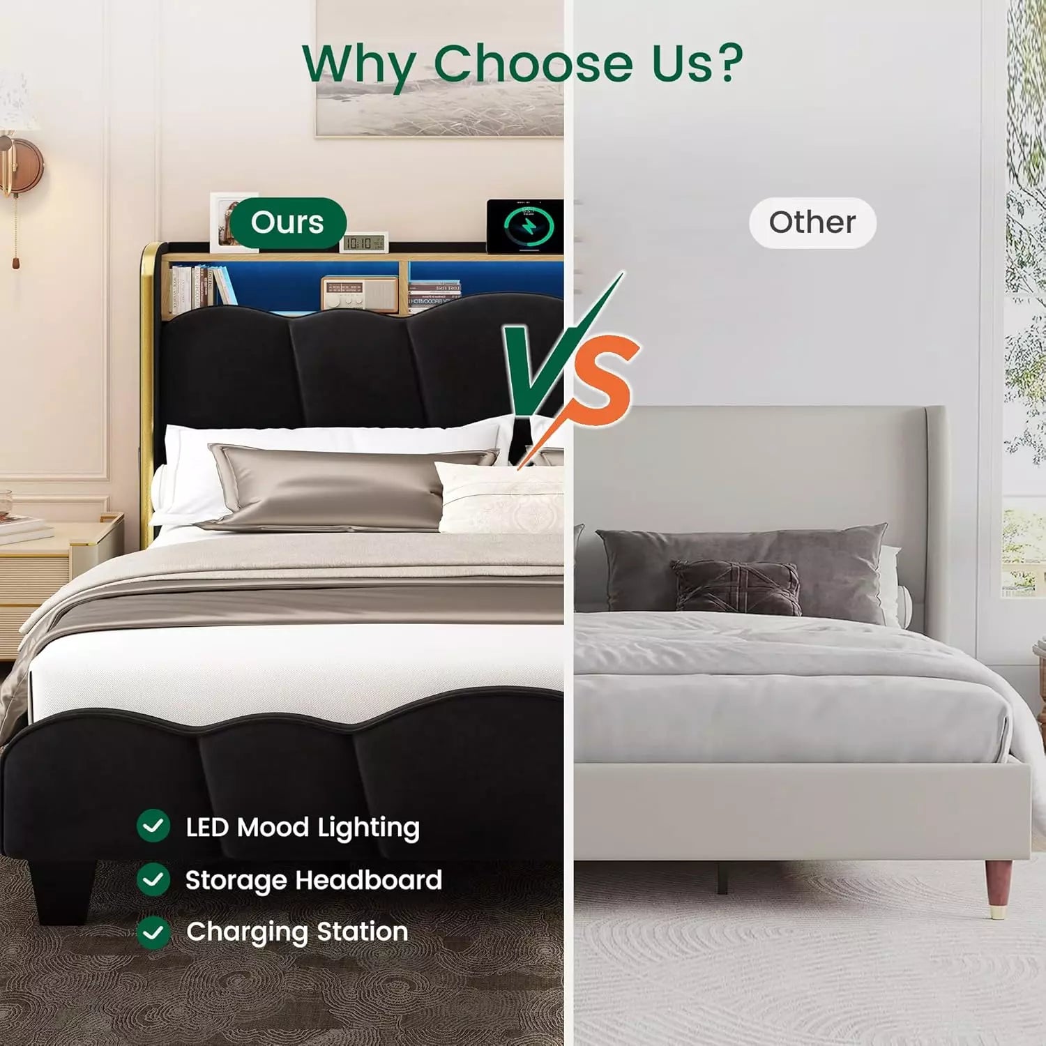 Contemporary Velvet Bed Frame with Charging Shelf & LED Options
