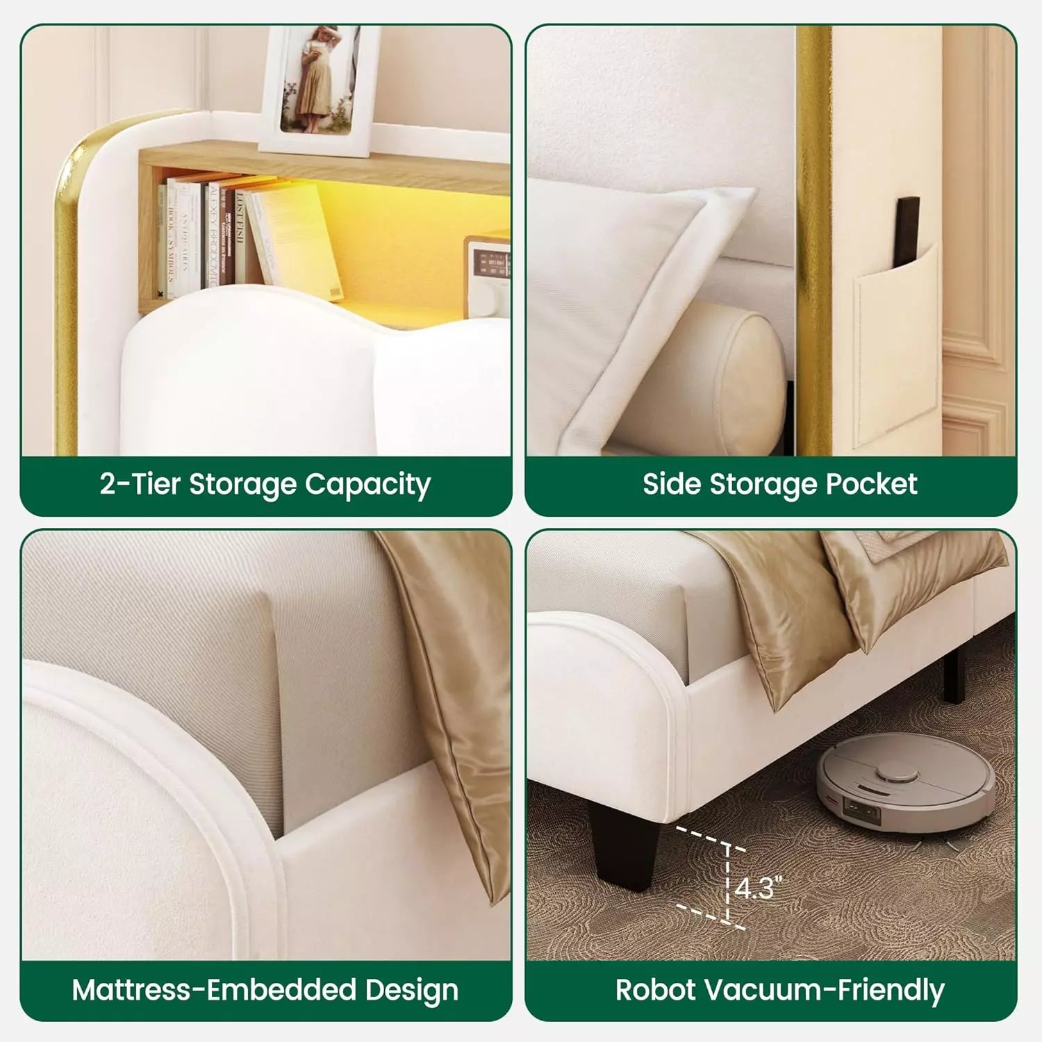Upholstered in soft, plush velvet, the curved arched headboard and footboard form an elegant focal point, while gold-trimmed wingback panels with built-in remote pockets add a luxurious touch. Choose from black or white color options, each enhanced with subtle gold accents to complement any contemporary or minimalist bedroom.