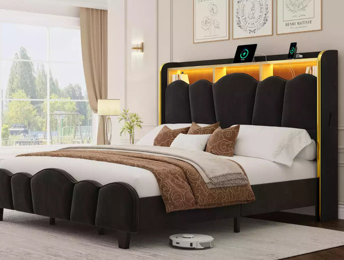 Contemporary Velvet Bed Frame with Charging Shelf & LED Options