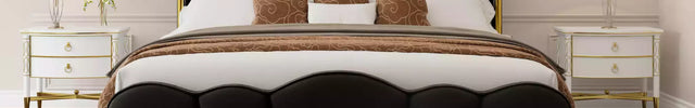 Upholstered in soft, plush velvet, the curved arched headboard and footboard form an elegant focal point, while gold-trimmed wingback panels with built-in remote pockets add a luxurious touch. Choose from black or white color options, each enhanced with subtle gold accents to complement any contemporary or minimalist bedroom.