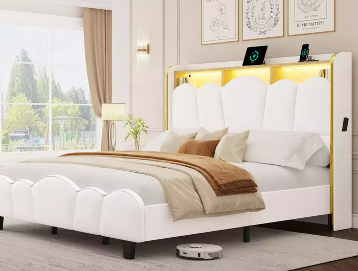 The modern upholstered bed frame effortlessly blends everyday utility with lotus-inspired design. Available in both Queen and King sizes, this frame features a built-in charging station with 2 power outlets, 1 USB port, and 1 Type-C port—keeping your devices powered and your nightstand tidy. A spacious two-tier headboard shelf provides extra room for books, décor, or nighttime essentials.