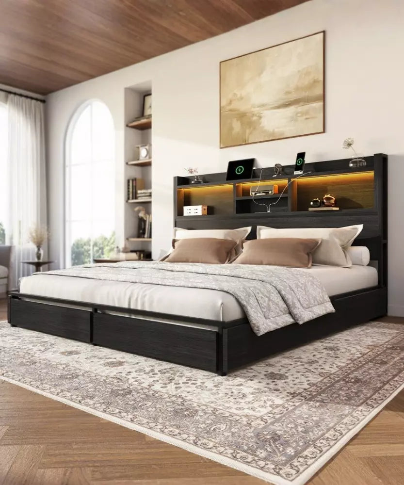 Expand your bedroom storage with this multifunctional bookcase platform bed frame with charging station and storage drawers.