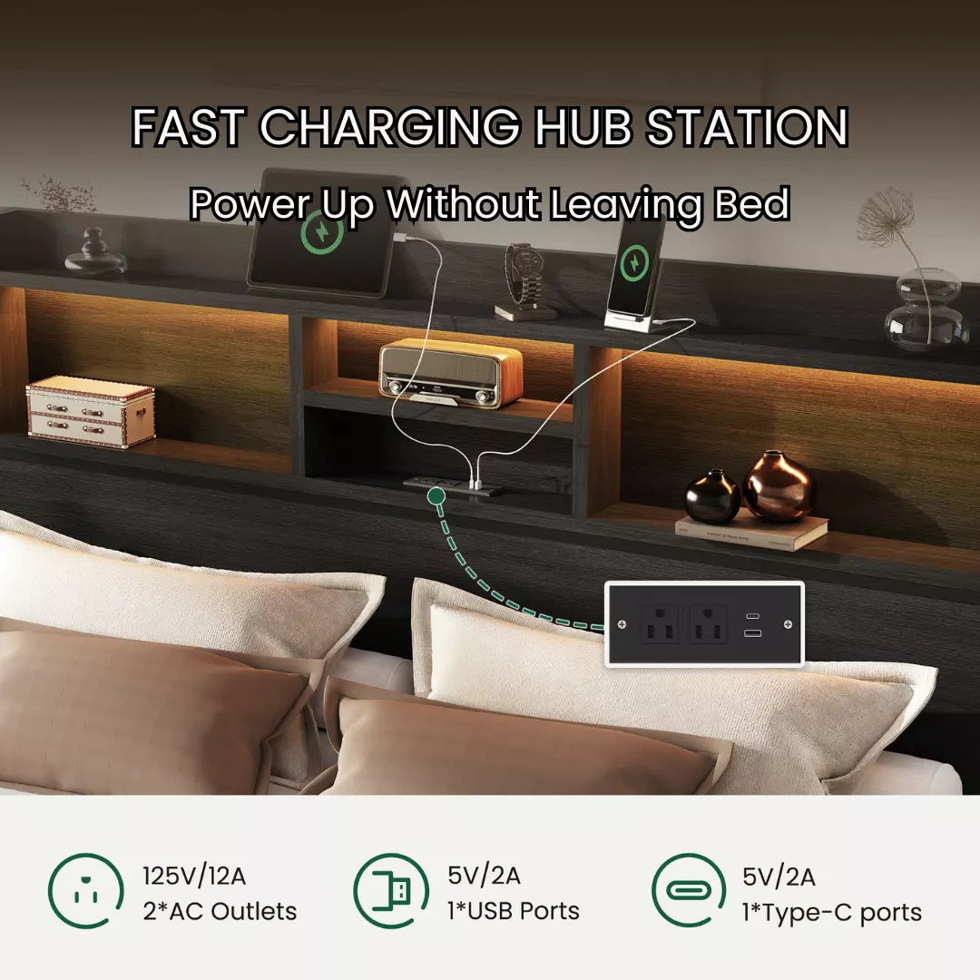 - Headboard storage: multi-size open cubbies for tablets, books, décor