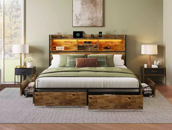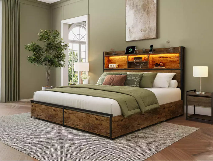 Expand your bedroom storage with this multifunctional wood platform bed frame with charging station and storage drawers.