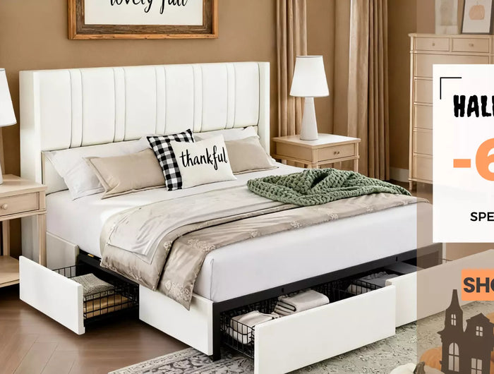 Add wheeled drawers, bookcase headboards, RGB LED mood lighting, and built-in USB-A/USB-C/AC power. Pick MDF wood with an eco wood-grain finish or go fully upholstered in breathable linen, velvet, corduroy, or boucle.